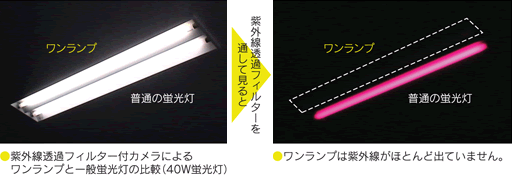 蛍光灯でワンランプと一般の製品との比較実験をしてみたところ、以下のような結果が出ました。