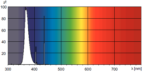 350〜400nm(Ultra Violet A)の波長域を放出し、365nm付近にピークを持つUVランプです。
