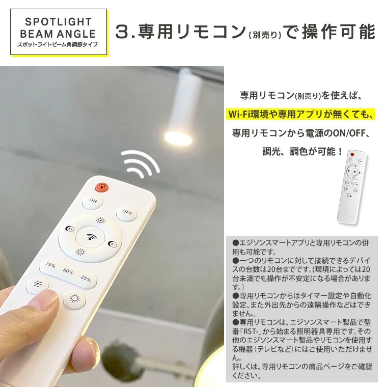 さらに、Wi-Fi環境がない場合でも電源のオンオフ・調光調色が可能な専用リモコン(別売り)対応製品です。