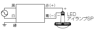LEDアイランプSPは直流点灯です。必ず専用電源ユニットと組合わせてご使用ください。(商用電源や安定器の二次側に直接接続しないでください)
