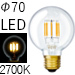 昔ながらの白熱電球と外観クオリティの違いがわからない程に精密に製造されているG70(φ70mm)サイズのLEDクリアボール電球です。調光にも対応。