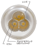 ■放熱を高めた高輝度・長寿命なLED レデューLED電球に搭載された3個の1W高輝度LEDパッケージは、高い熱伝導性と優れた放熱性をもつアルミナセラミックを採用、ヒートシンクとなるランプ筐体部にも同様にアルミナセラミックを使用することで、熱によるLEDへのダメージを抑え、LEDのパワーを最大限に引き出しています。 その結果、わずか3.5Wの消費電力で、40W ミニレフランプ相当の明るさ(最大光度:300cd)を実現するとともに、光束の減衰を抑え、使用開始後20,000時間での光束維持率約97%※3とランプ寿命末期までほどんど減衰がない美しい光を照射し続けます。 ※3 LEDのパッケージ材による光束維持比較参照 |