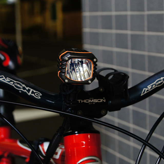 搭載LEDはCREE MC-E HIモードで3.5時間、MID5時間、LOW9時間、点滅6時間となります。光源となるLEDはヘッドユニット内部の上部にあり、リフレクターの反射を利用して前方へと照射します。対向車や歩行者に対して眩しくないよう路面だけをを照らすように工夫された照射システムとなっております。照度維持機能に優れ、ヘッド背面にはバッテリー残量を示すインジケーターランプが装着されております。バッテリー残量は青(十分)→黄色(そろそろ充電)→赤(要充電)。