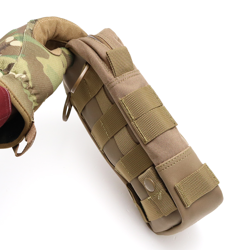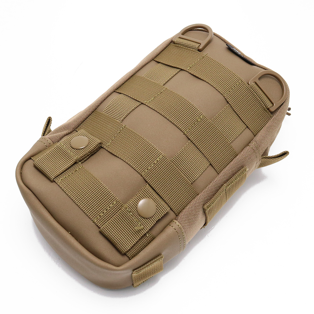 背面にはモールシステムのウェビングを備えており、モールシステムに対応するバッグなどに簡単に装着できます。表面、左側面にはさらに追加するためのウェビングを装備。お好みに応じてポーチ類を増やすことができます。