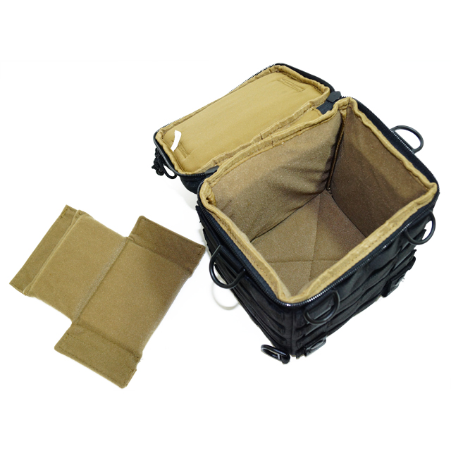 バック内部はベルクロで調整可能なパッドがあり、収納するカメラの大きさに合わせてパッドの位置が変えられます。内装は頻繁なカメラの出し入れをしてもカメラに対するダメージを軽減する柔らかな生地を使用。バック自体のパッドの厚みも充分にあり、大切なカメラを衝撃や振動から保護します。