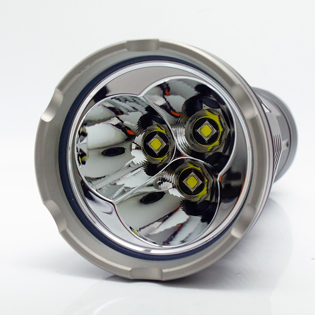 エアクラフトグレードアルミ合金にTYPE3HAが施された丈夫で軽量なボディ。 低反射コートされたガラスレンズに落下時の衝撃からレンズを守るステンレスベゼルを装着。スムースリフレクターによる集光配光。LEDが3灯付いておりますが、照射光は1本の光軸になります。