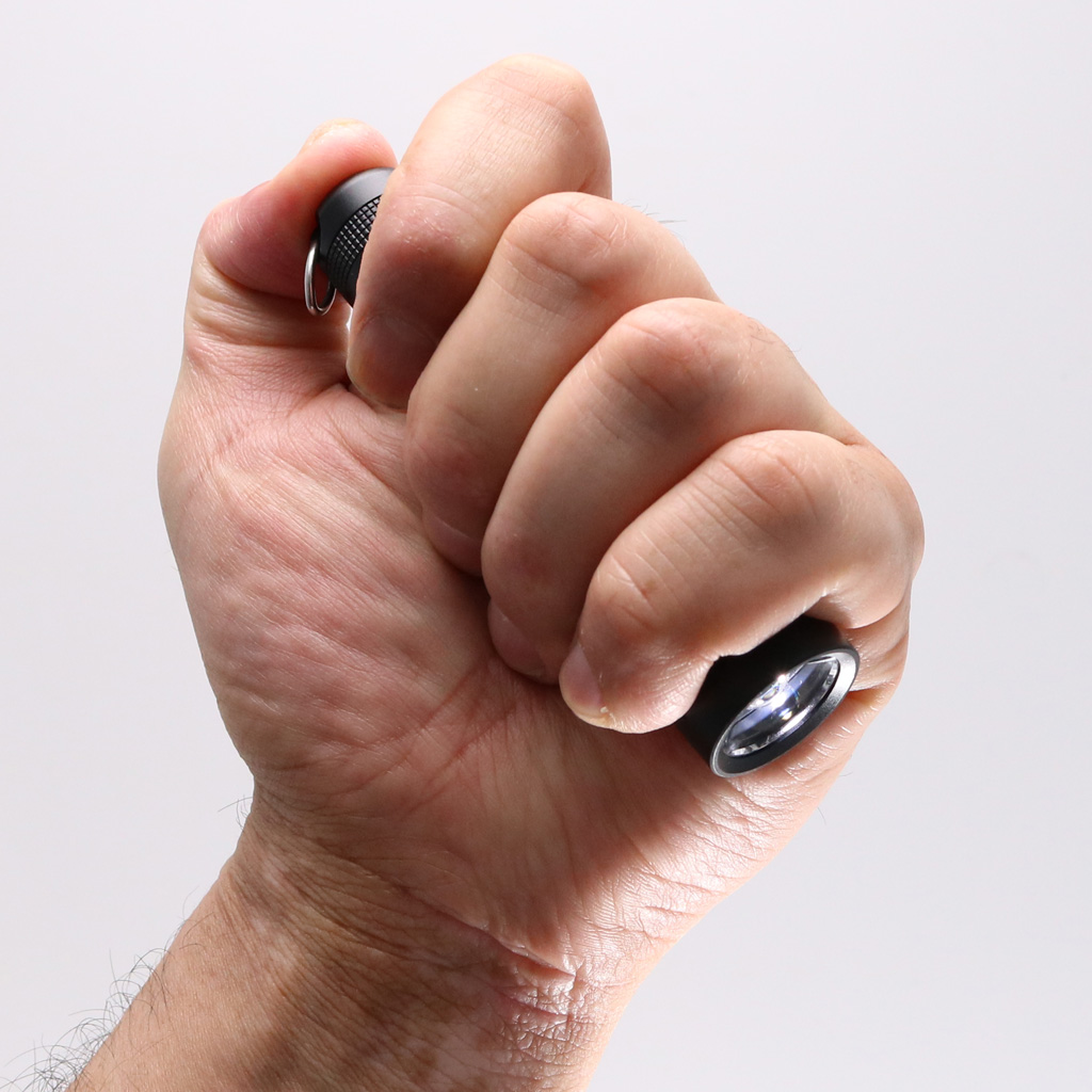 スイッチはボディ後部にあります。押しやすく、レスポンスの良いスイッチ。 片手で操作する機会の多いキーライトには便利な機能。 半押しで推している間だけの一時的な点灯、クリック音がするまで押しこむと常時点灯します。調光などの煩雑なシステムはありません。ロックアウト機能はありません。
