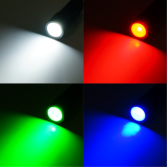 単四乾電池3本使用。テールスイッチは無く、ヘッドを任意の色に合わせて回転させるとその色が点灯します。カラーはホワイト、レッド、グリーン、ブルーの4色。 レンズ部分は拡散用のディフューザーカバーで覆われ、近距離をムラ無く広く照らす仕様になっております。