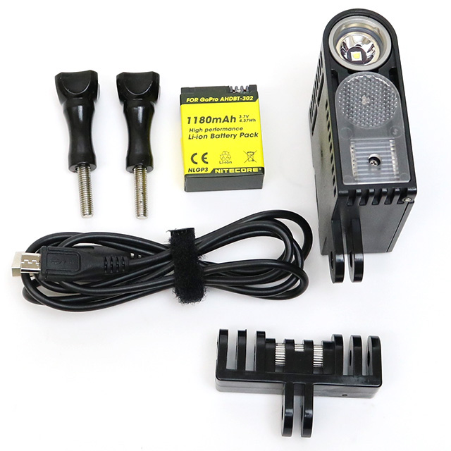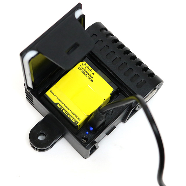GP3は通常のフラッシュライトとは異なり、ほぼ直方体の四角いボディが印象的です。前面にリフレクターがあり、その反対側の後面に操作スイッチがあります。本体左側面にバッテリーを搭載。このバッテリーはGoPro用AHDBT-302と互換性があり、お互いに予備バッテリーとして使用することができます。付属のマイクロUSBケーブルを挿すことで簡単に充電することができます。充電中は給電ポート横の青色のインジケーターが点滅して充電中であることを示します。