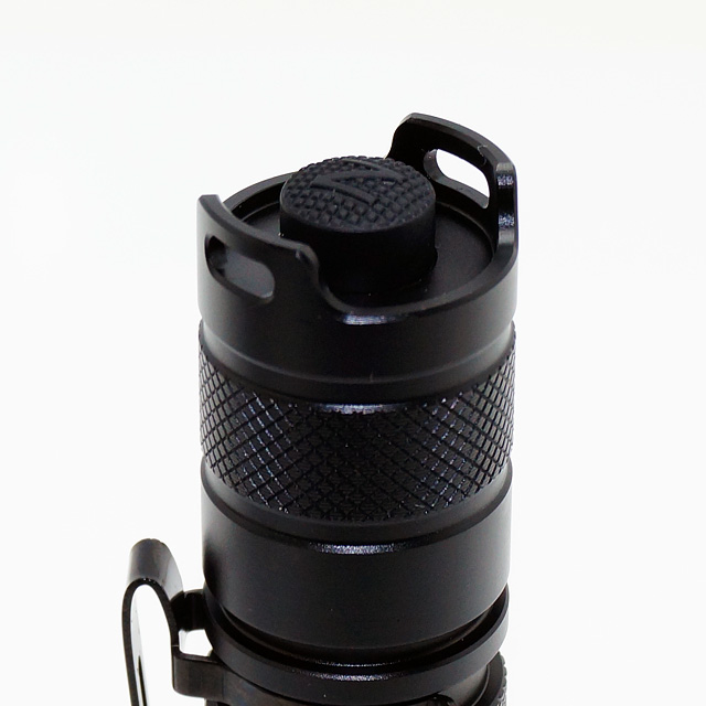 ボディはフルメタルのアルミ合金製。ヘッドからテールにかけて凹凸が少なくストレートでスリムな印象があります。テールスイッチはグローブなどをしていても押しやすい凸状のボタンを採用。半押しでの間欠点灯も可能なタクティカルな仕様。