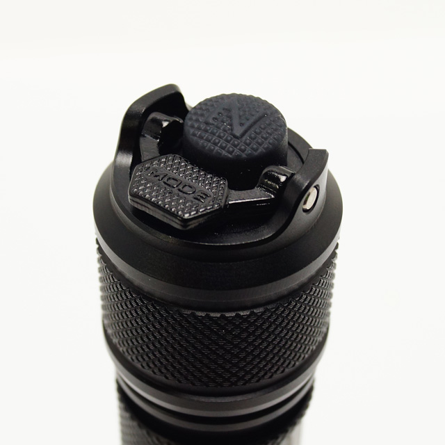 丸いメインスイッチをクリックすると常時点灯。半押しでの間欠点灯も可能。常時点灯後、modeスイッチを短く押す毎に4段階の調光が可能。何れの状態からもmodeスイッチ長押しでストロボ点滅します。また、modeスイッチを2回早押しするとターボモードにダイレクトにアクセス。ターボモードになったときにmodeスイッチをプレスするとストロボ点滅の間欠点灯が可能です。非常にタクティカルユースに徹したアグレッシブな設定です。