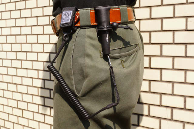 樹脂の塑性(そせい)を利用してライトを固定します。ライトを抜く時はロック紐を緩めて、少し前にライトを倒して引き抜くか、抜き難い場合は人差し指をホルスターに差し入れて広げて引き抜きます。