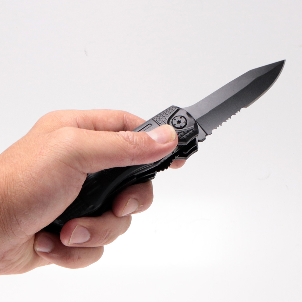 折りたたみ時の全長は115mm、ナイフ展開時は195mm。重量244g ややズッシリとした重量感は、グリップエンドにあるタングステンスパイクでガラスを割る時に役立ちます。