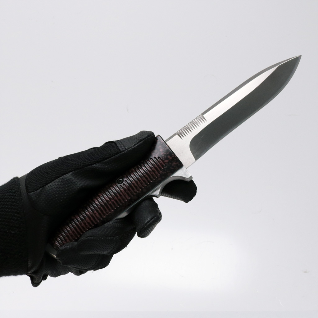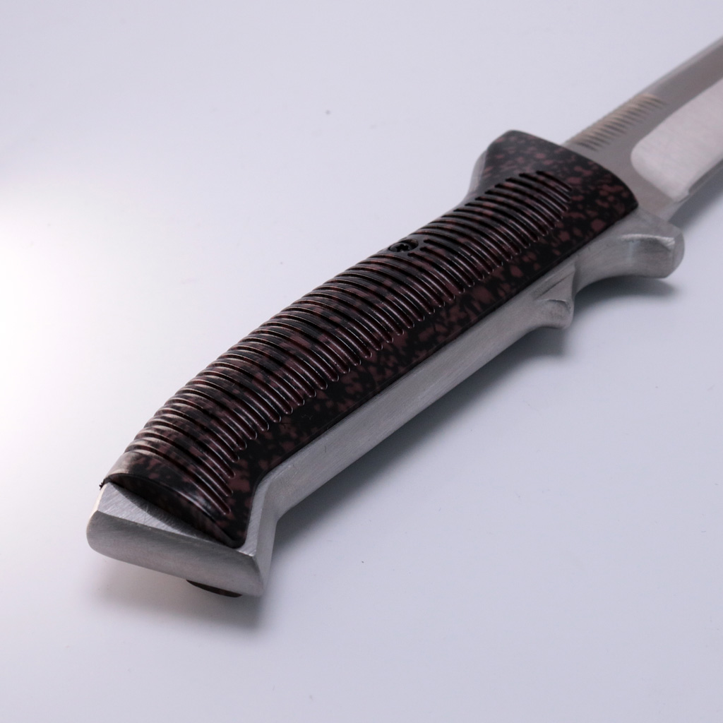 刃渡り135mmのブレード部は丈夫な440Cステンレス鋼。グリップ部はシンセティック。丸みを帯びたグリップ部がP38を彷彿とさせます。
