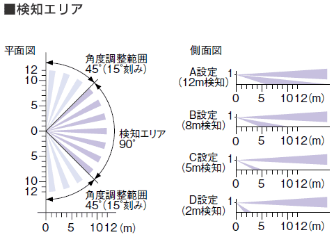 ●センサ部の下向き角度を変えることで、検知範囲を2・5・8・12mの4段階で自由に設定できます。