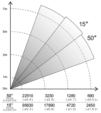 | 光学出力 | Lux@1m※ | 95630Lux (15°) / 22510Lux (50°) ※各個体差により、誤差が生じます。 |