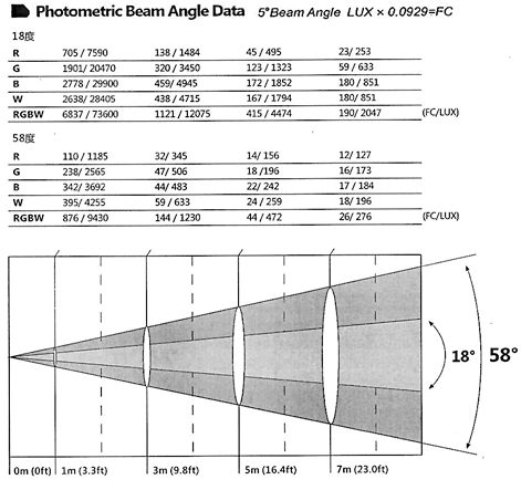 | 光学出力 | Lux@1m※ | 73600Lux (18°RGBW) / 9430Lux (58°RGBW) ※各個体差により、誤差が生じます。 |