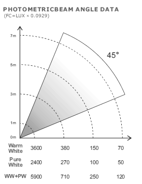 | 光学出力 | Lux@1m※ | 5900Lux (WW+PW) / 3600Lux (WW) / 2400Lux(PW) ※各個体差により、誤差が生じます。 |